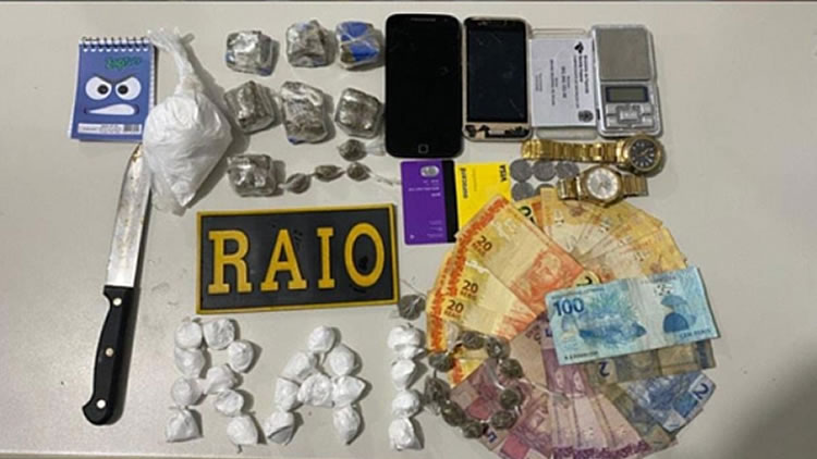 No interior da sacola, os agentes encontraram vários papelotes de cocaína e maconha, uma balança de precisão, um saco de pó branco com 245 gramas de substância análoga à cocaína, 164 gramas de maconha em tablete,14 trouxinhas de maconha, R$ 335, 00, 2 celulares, 2 relógios de pulso e vários cartões de crédito.